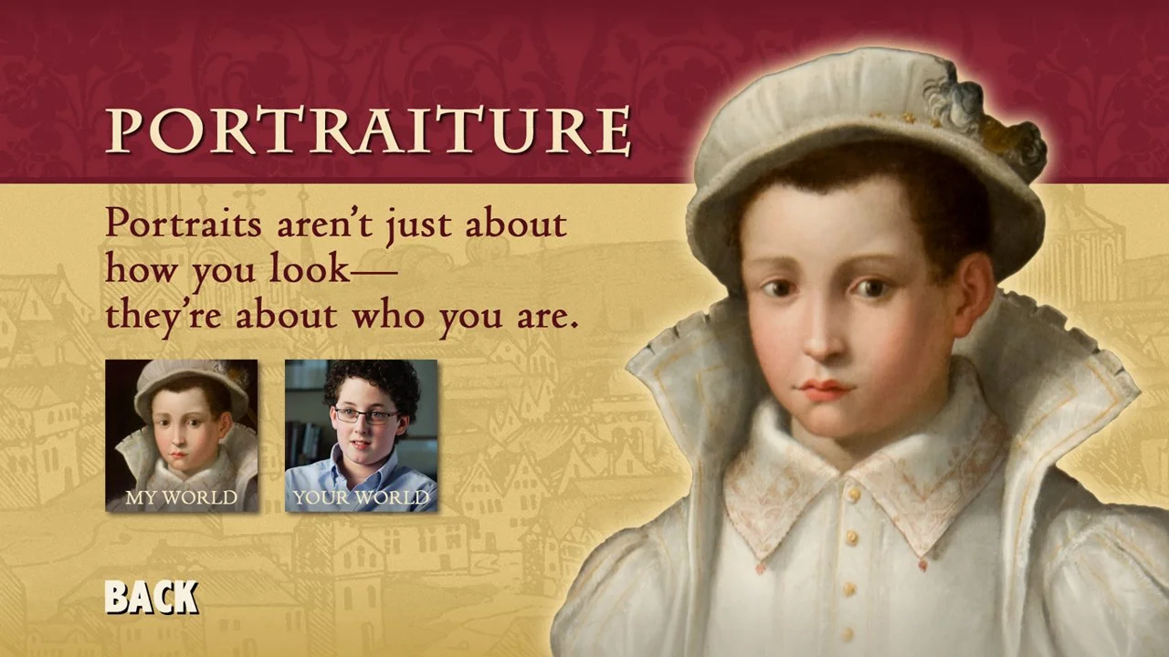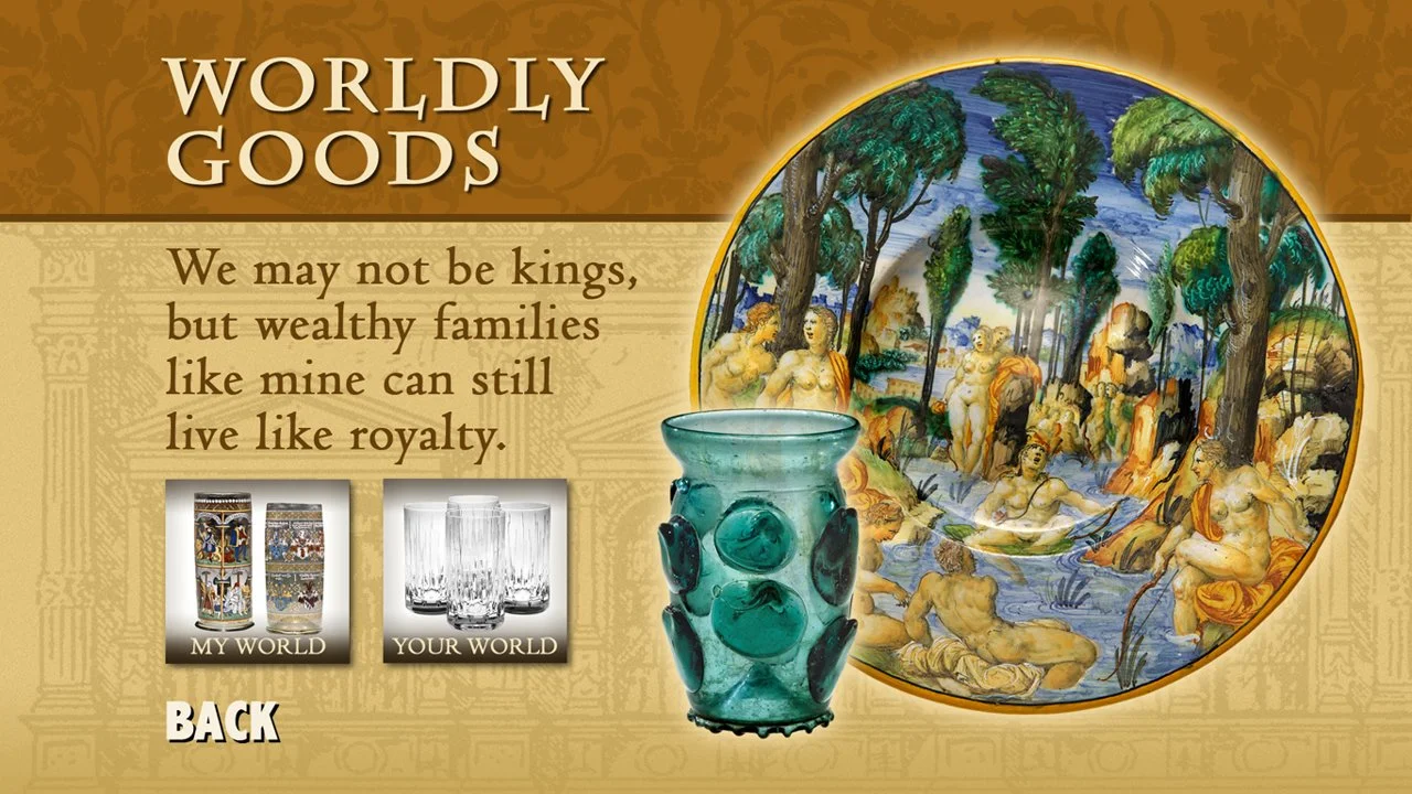 The goal of the interactive was to make these themes come alive by featuring a contemporary person and a historic first-person narrative, based on an individual who lived during the Renaissance, with related interest for each theme. (The historic narratives are not available for web release.)