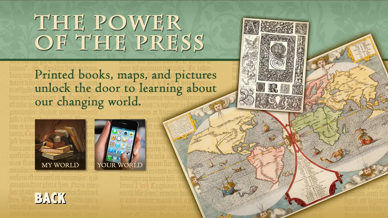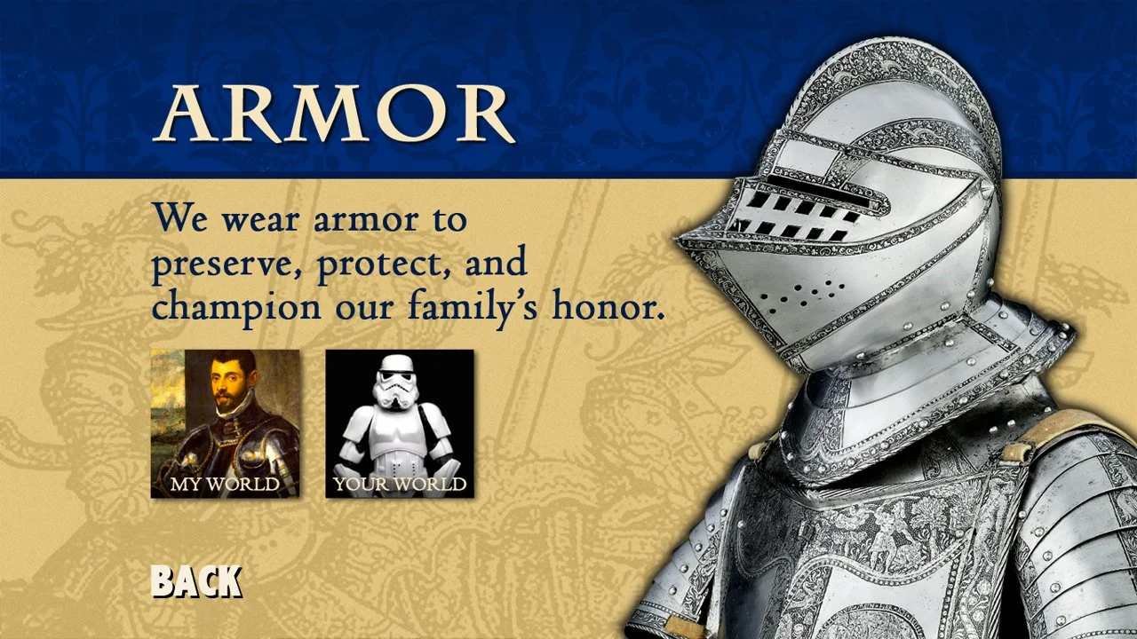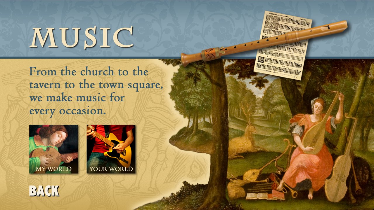 The Renaissance Remix media interactive is installed in an exhibit of the same name and explores the Renaissance “spirit of change” through five major themes: portraiture, armor, music, worldly goods, and the power of the press.